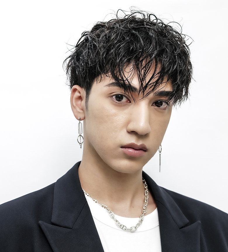 ”ソフトな中にハードさも感じる”パーマと、ウェットな質感と顔にかかる髪の長さが中性的なイメージを感じさせてくれるヘアスタイル。