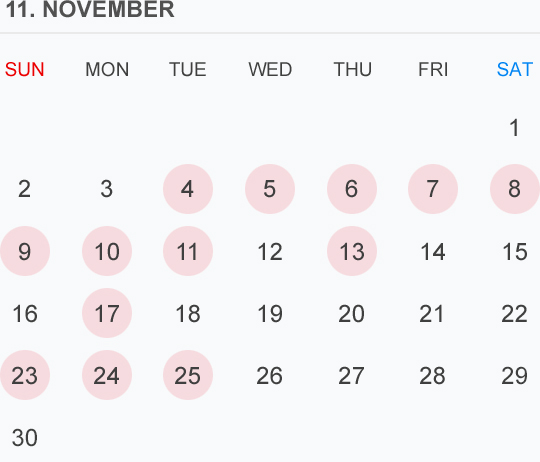 11月のカレンダー🗓です⭕️🟡⚪️はお休みいただいております