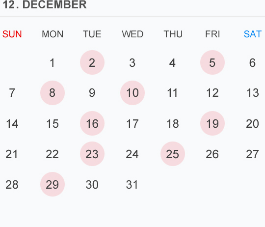 12月のカレンダー🗓です⭕️🟡⚪️はお休みいただいております