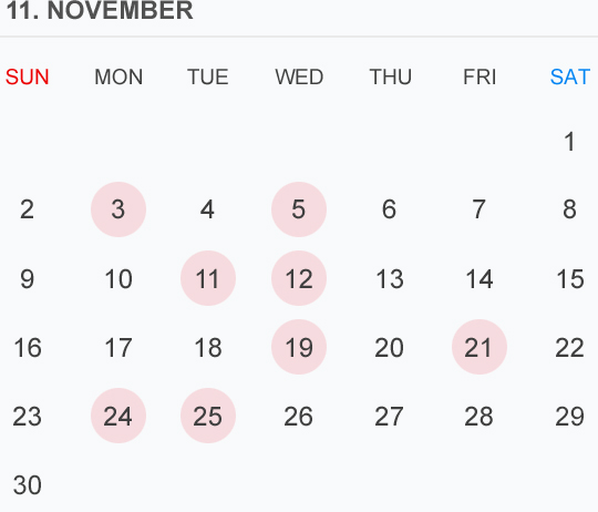 11月のカレンダー🗓です⭕️🟡⚪️はお休みいただいております