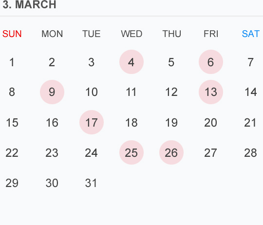 3月のカレンダー🗓です⭕️🟡⚪️はお休みいただいております