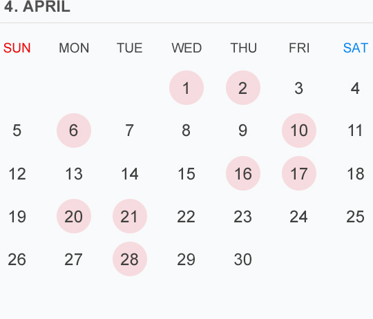 4月のカレンダー🗓です⭕️🟡⚪️はお休みいただいております