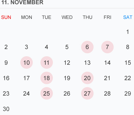 11月のカレンダー🗓です⭕️🟡⚪️はお休みいただいております