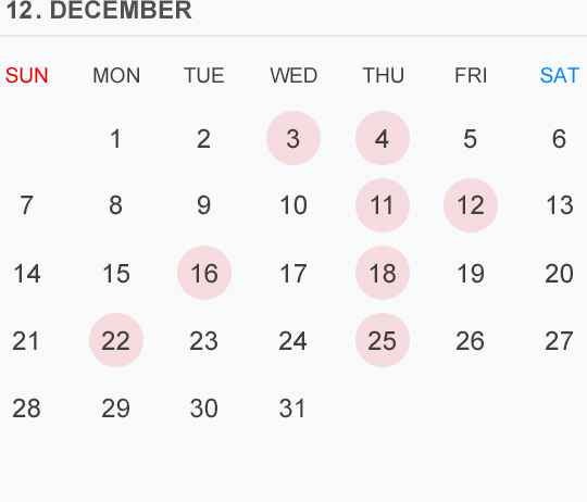 12月のカレンダー🗓です⭕️🟡⚪️はお休みいただいております