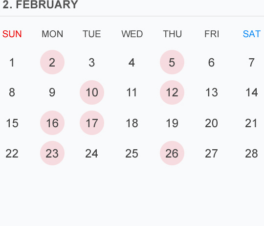 2月のカレンダー🗓です⭕️🟡⚪️はお休みいただいております