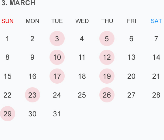 3月のカレンダー🗓です⭕️🟡⚪️はお休みいただいております
