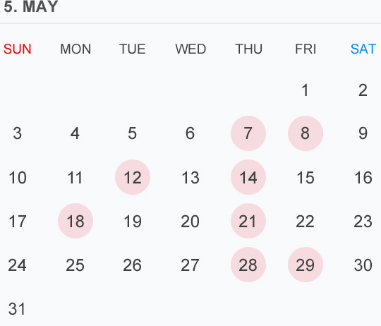 5月のカレンダー🗓です⭕️🟡⚪️はお休みいただいております