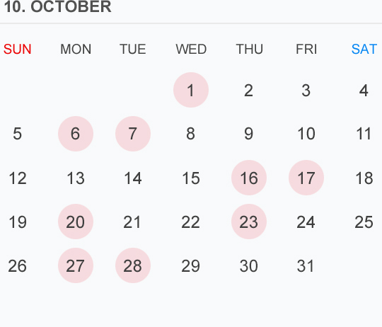 10月のカレンダー🗓です⭕️🟡⚪️はお休みいただいております