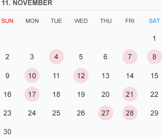 11月のカレンダー🗓です⭕️🟡⚪️はお休みいただいております