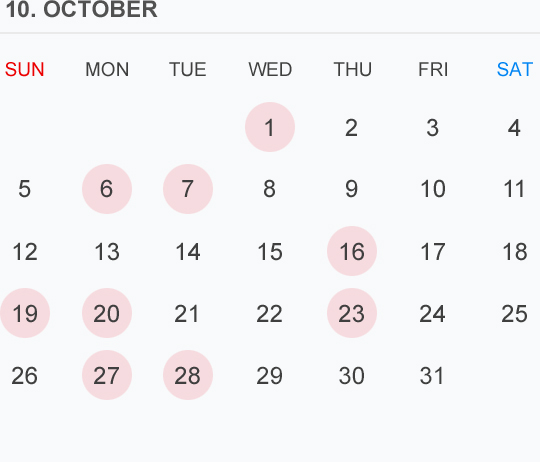 10月のカレンダー🗓です⭕️🟡⚪️はお休みいただいております