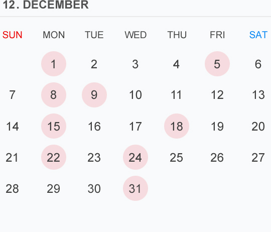 12月のカレンダー🗓です⭕️🟡⚪️はお休みいただいております