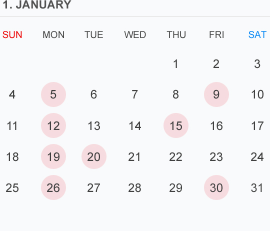 1月のカレンダー🗓です⭕️🟡⚪️はお休みいただいております