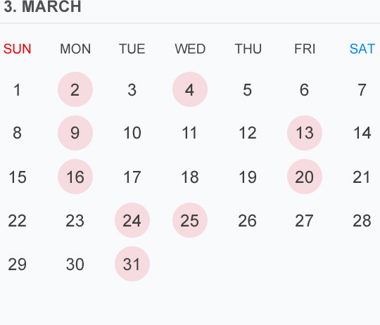 3月のカレンダー🗓です⭕️🟡⚪️はお休みいただいております