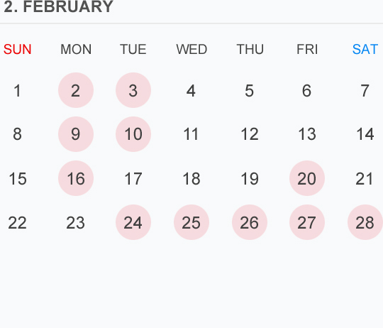2月のカレンダー🗓です⭕️🟡⚪️はお休みいただいております