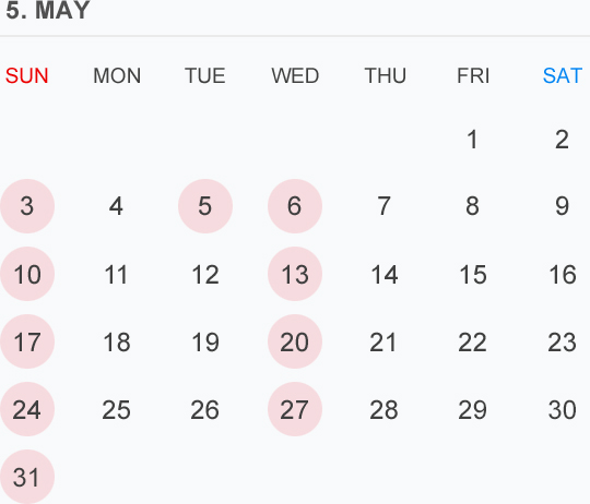 5月のカレンダー🗓です⭕️🟡⚪️はお休みいただいております