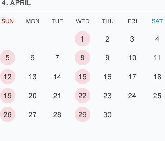 4月のカレンダー🗓です⭕️🟡⚪️はお休みいただいております