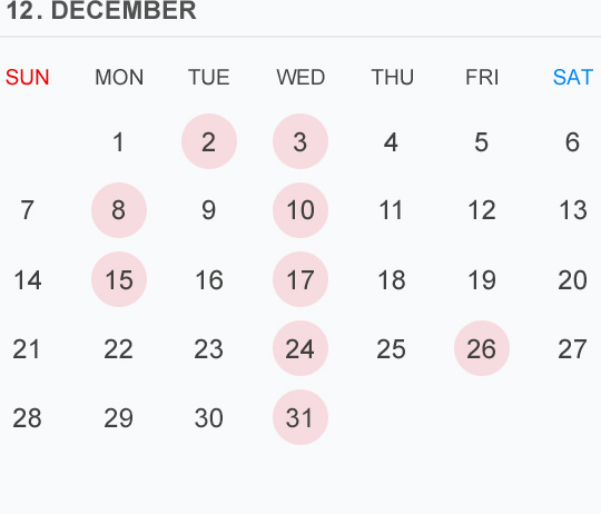 12月のカレンダー🗓です⭕️🟡⚪️はお休みいただいております