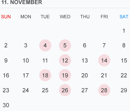 11月のカレンダー🗓です⭕️🟡⚪️はお休みいただいております