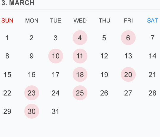 3月のカレンダー🗓です⭕️🟡⚪️はお休みいただいております