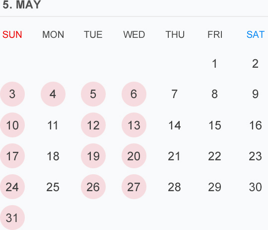 5月のカレンダー🗓です⭕️🟡⚪️はお休みいただいております