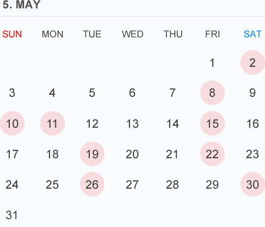 5月のカレンダー🗓です 🔴⚪️🟡はお休みを頂いております
