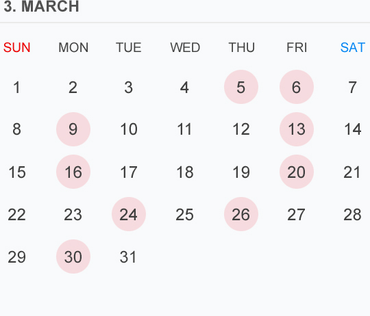 3月のカレンダー🗓です⭕️🟡⚪️はお休みいただいております