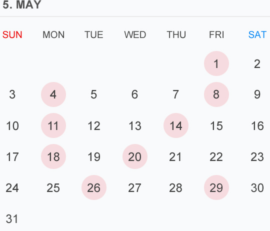 5月のカレンダー🗓です⭕️🟡⚪️はお休みいただいております