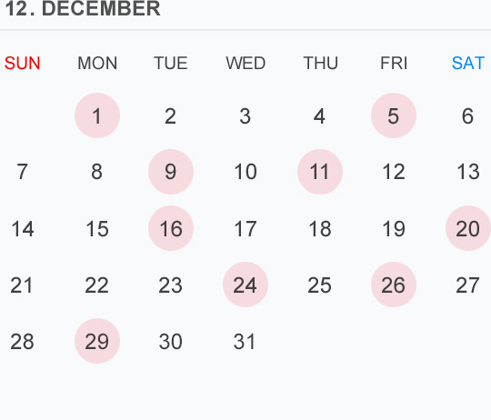 12月のカレンダー🗓です⭕️🟡⚪️はお休みいただいております