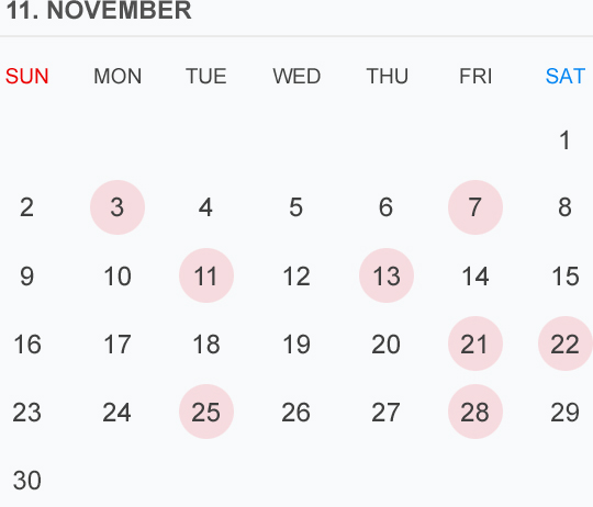 11月のカレンダー🗓です⭕️🟡⚪️はお休みいただいております