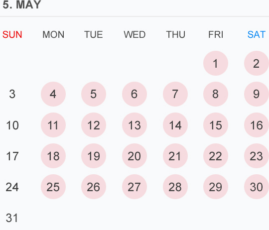 5月のカレンダー🗓です⭕️🟡⚪️はお休みいただいております