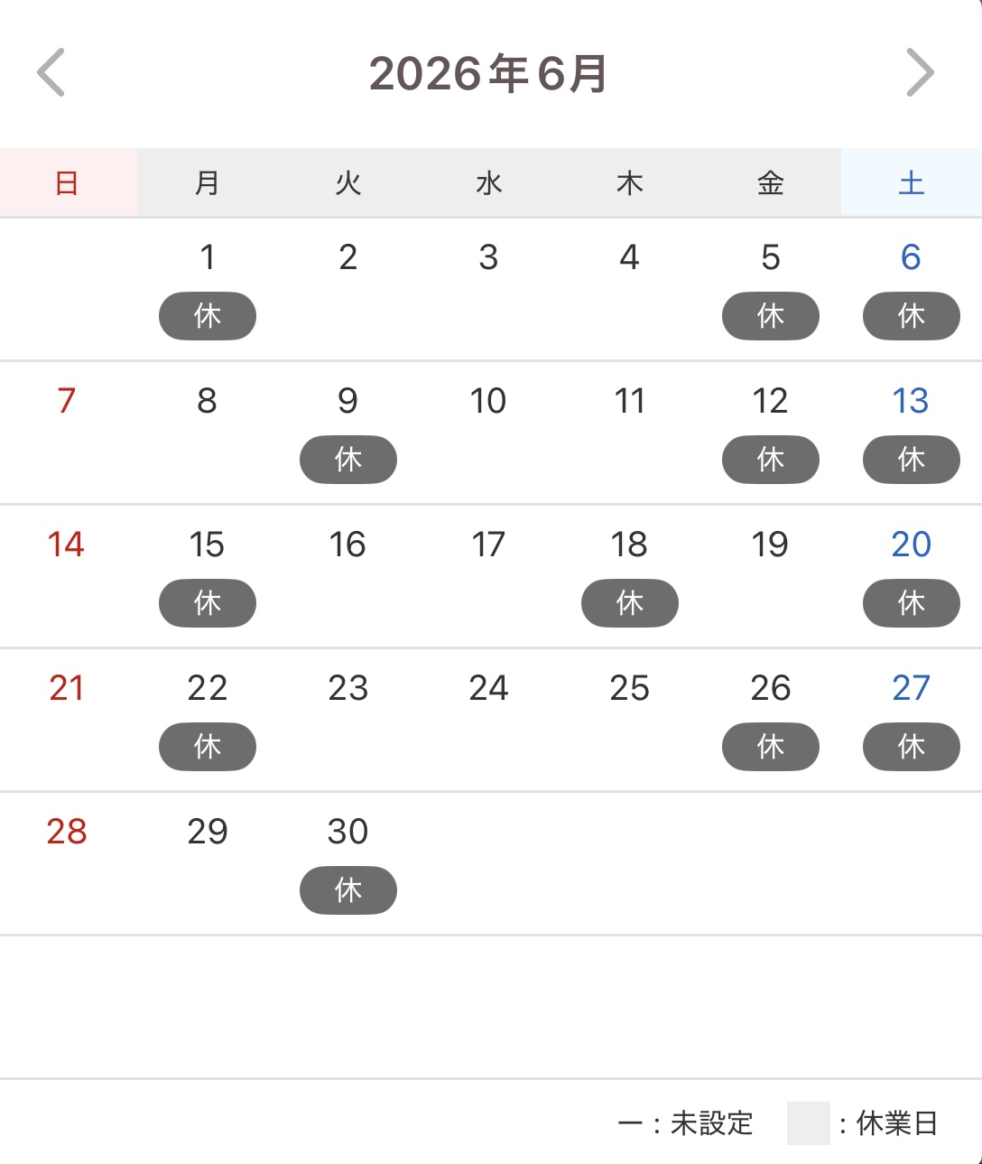 6月のカレンダー🗓です⭕️🟡⚪️はお休みいただいております
