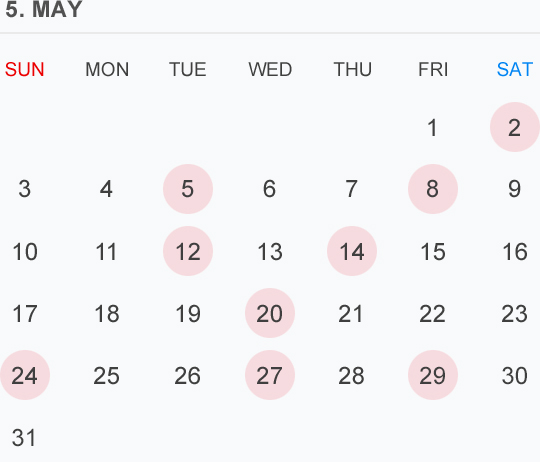 5月のカレンダー🗓です 🔴⚪️🟡はお休みを頂いております