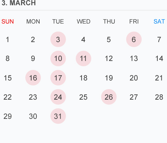 3月のカレンダー🗓です⭕️🟡⚪️はお休みいただいております