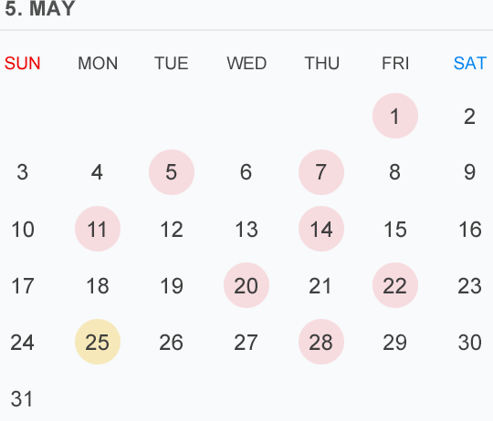 5月のカレンダー🗓です 🔴⚪️🟡はお休みを頂いております