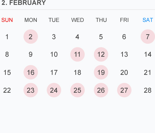 2月のカレンダー🗓です⭕️🟡⚪️はお休みいただいております