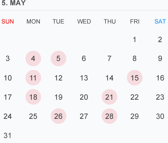 5月のカレンダー🗓です⭕️🟡⚪️はお休みいただいております