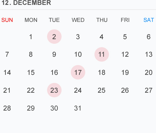12月のカレンダー🗓です⭕️🟡⚪️はお休みいただいております