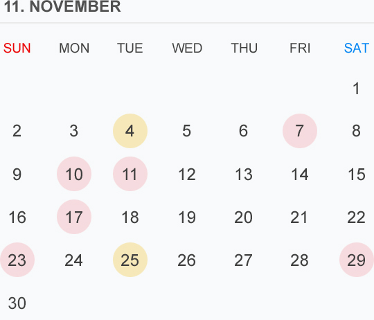 11月のカレンダー🗓です 🔴⚪️🟡はお休みを頂いております