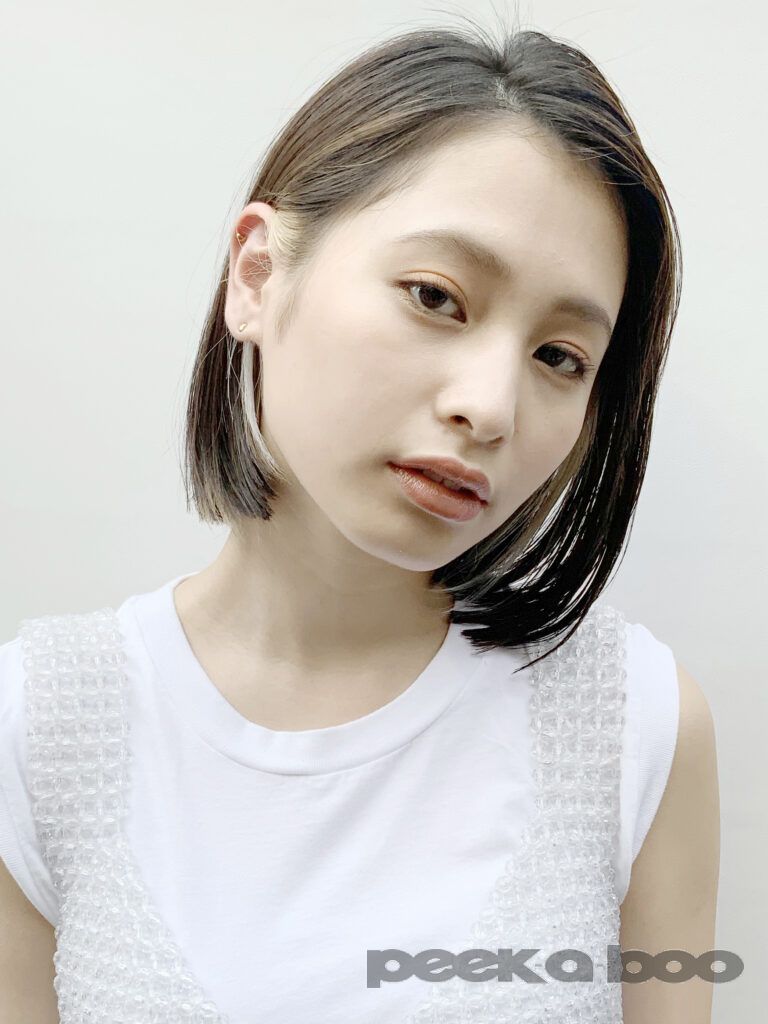 前髪を少し幅広めのワイドバングににすることで個性を出しながら、抜け感を出しているところがポイントのボブです。切りっぱなしのボブなので、ストレートアイロンで少し外ハネをつくってオイルやバームを馴染ませれば出来上がりです。耳に髪をかけてよりコンパクトに仕上げています。