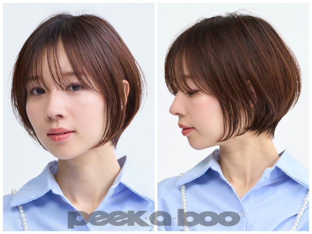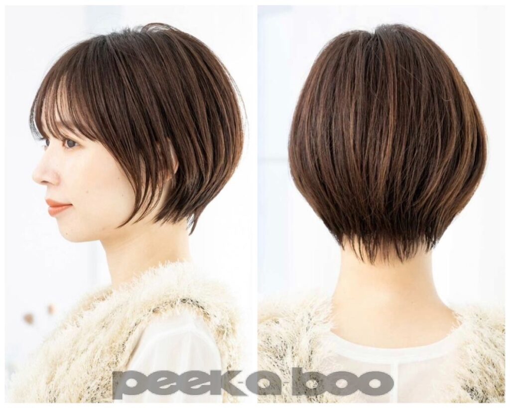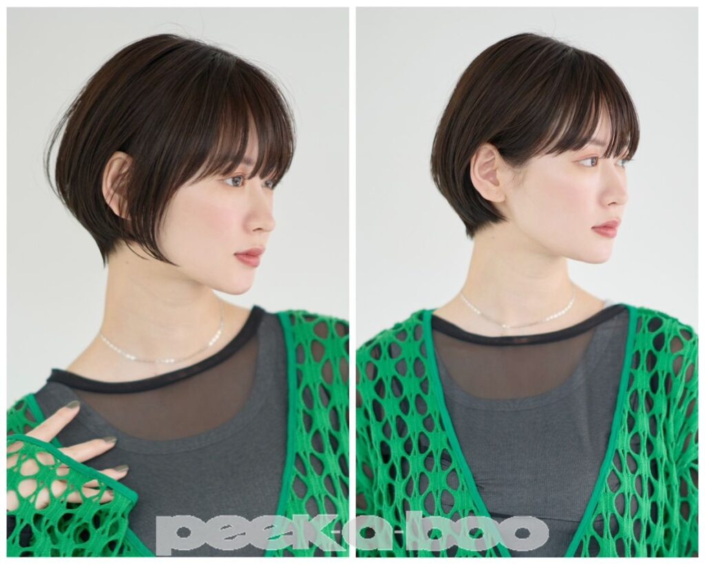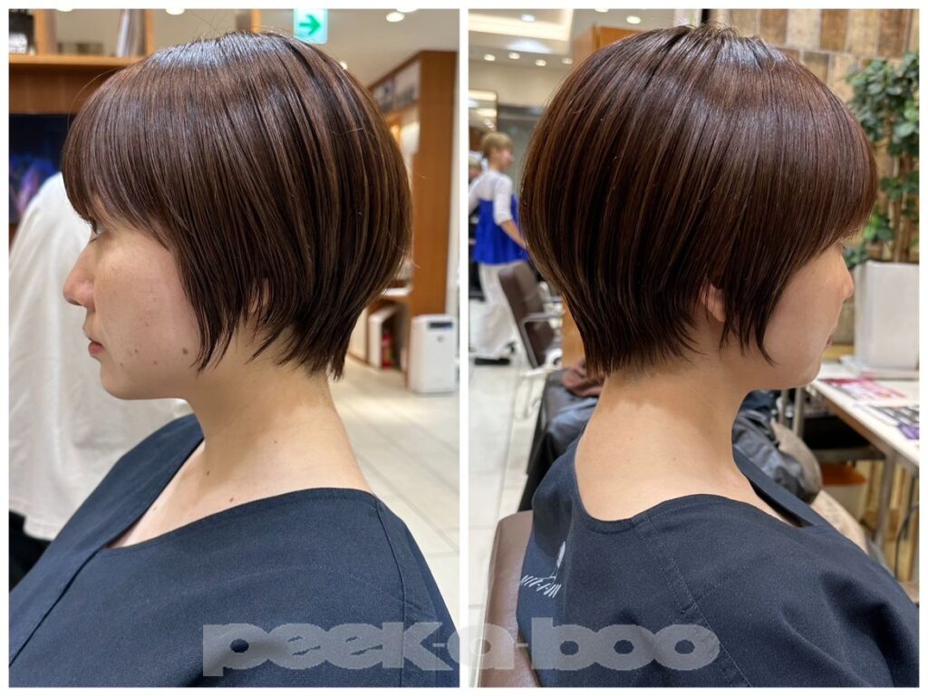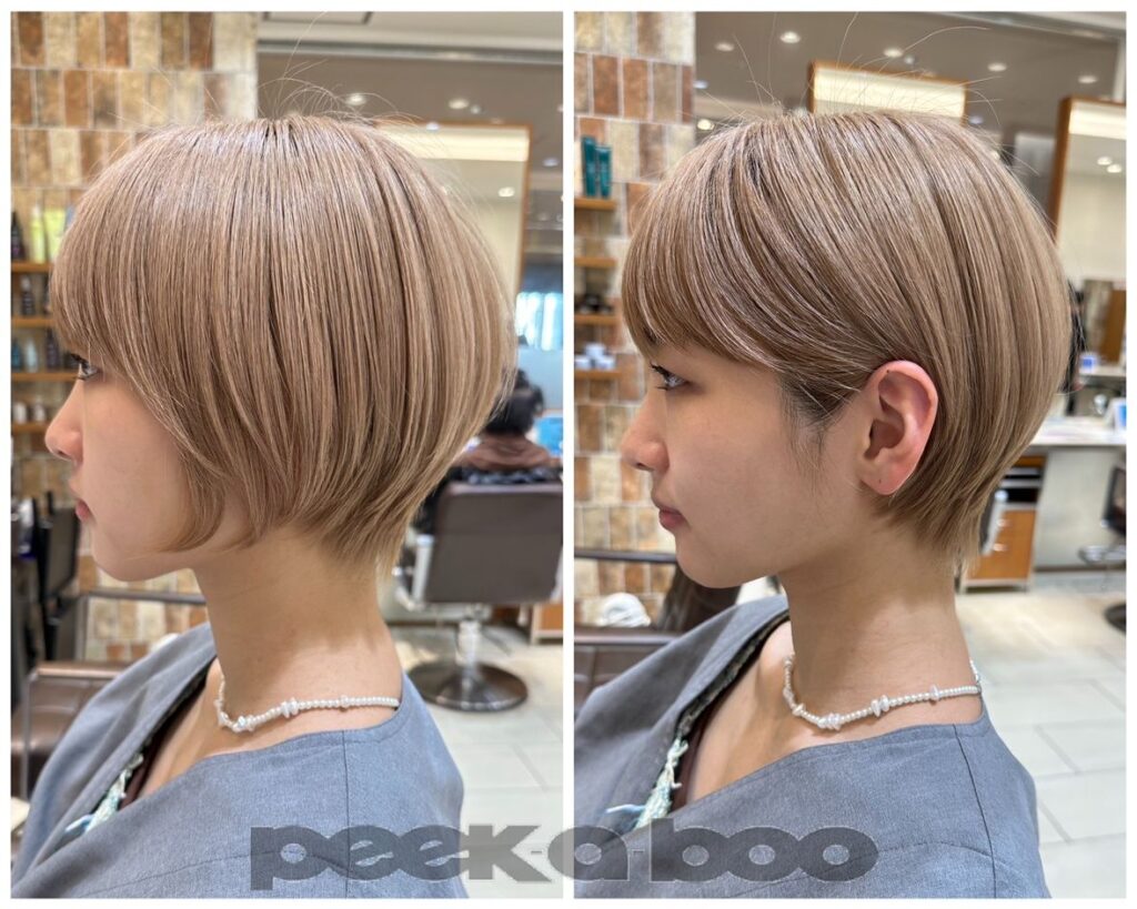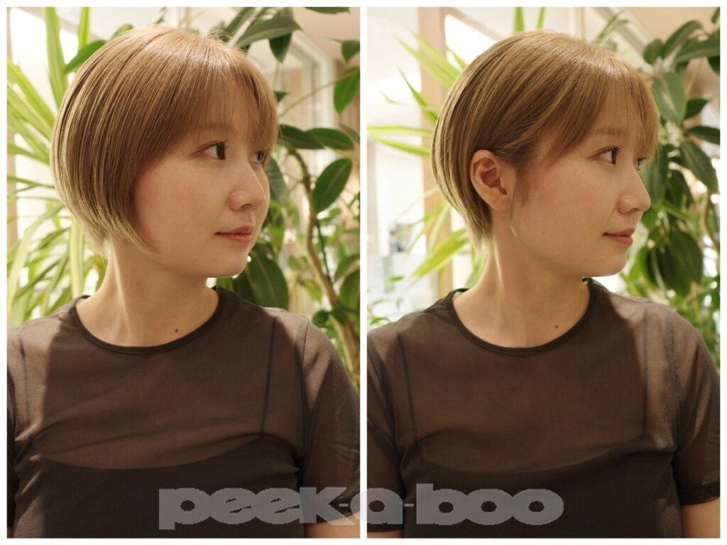 耳にかけなければ奥行のあるショートボブ、耳にかけるだけでよりシャープなショートカットに見えますので、その日の気分に合わせて2つのショートスタイルをお楽しみください☆