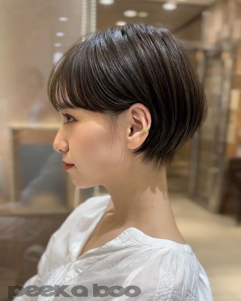 前髪なしのショートボブだと、大人っぽく上品さを引き立たせてくれます。