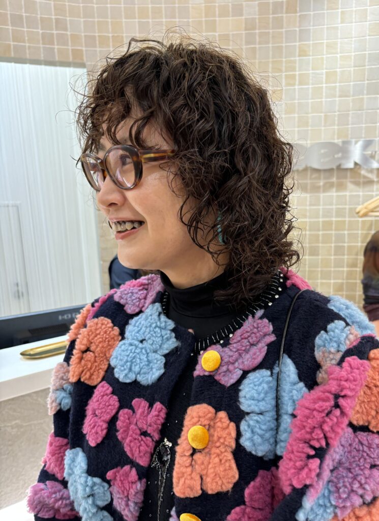 強めのパーマで前から見た時に丸いシルエットにしたい!!!ということで、ウルフベースにしっかりと強めのパーマをかけています!