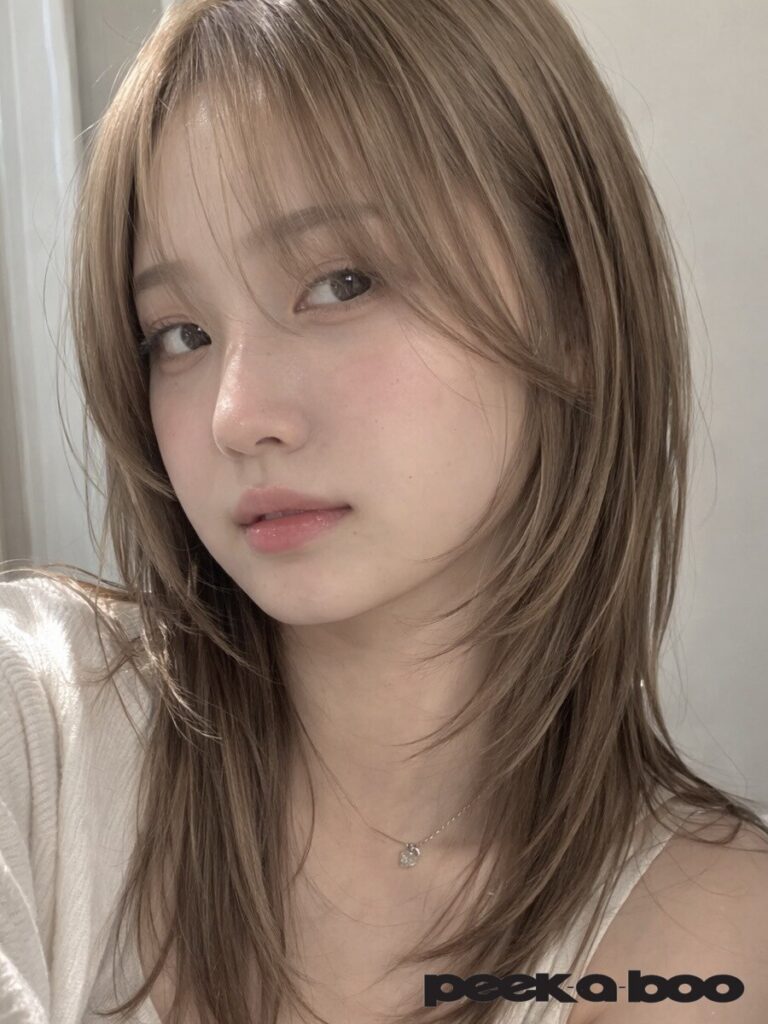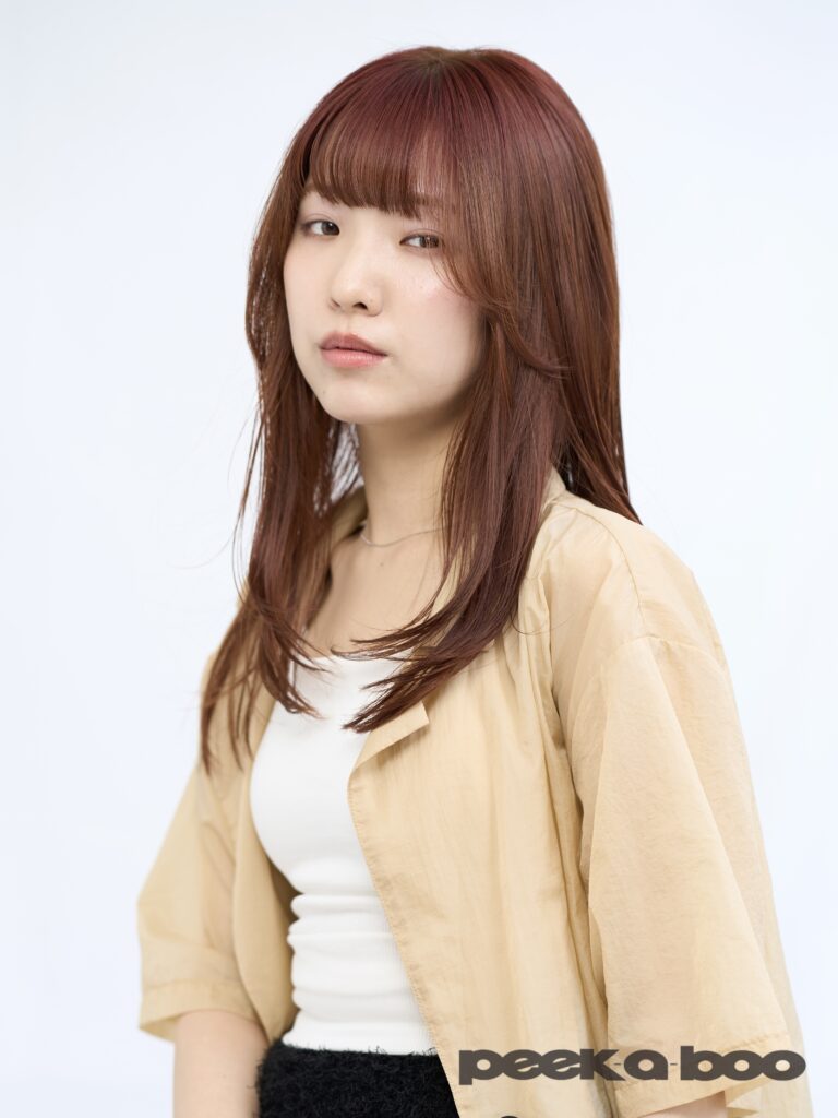 顔まわりにレイヤーを入れることで動きが出やすく、巻いた時も自然な立体感が生まれるのがポイント。重く見えがちなロングヘアでも、軽さと抜け感のある今っぽい雰囲気に仕上がります。