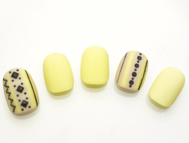 春から夏に向けて、ターコイズ風ネイルに。 お持ちのアクセサリーとコーディネートしてみては? レモンイエローとグレーベースにブラックをアクセントに マットに仕上げて大人エスニックネイルに。